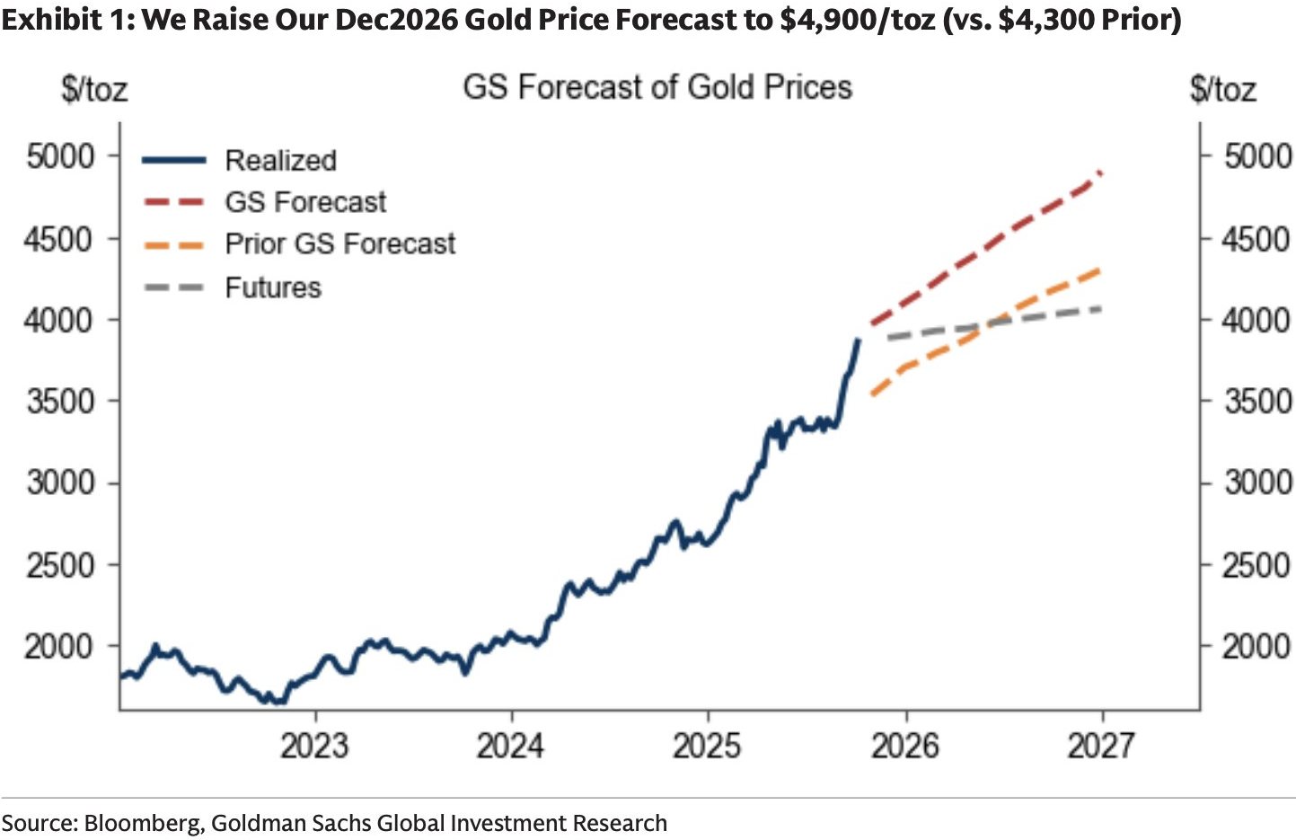 Vollbild / "Goldman Sachs hat seine Prognose für den Goldpreis im Dezember 2026 auf $4.900 USD/Unze (von zuvor $4.300 USD) angehoben und begründet dies mit starken und anhaltenden Zuflüssen, die seit dem 26. August zu einem Anstieg von 17% geführt haben. Die Bank geht davon aus, dass die anhaltenden Käufe westlicher ETFs und Zentralbanken von Dauer sein dürften, was sie dazu veranlasst hat, das Basisniveau ihrer Preisprognose anzuheben." (Quelle)