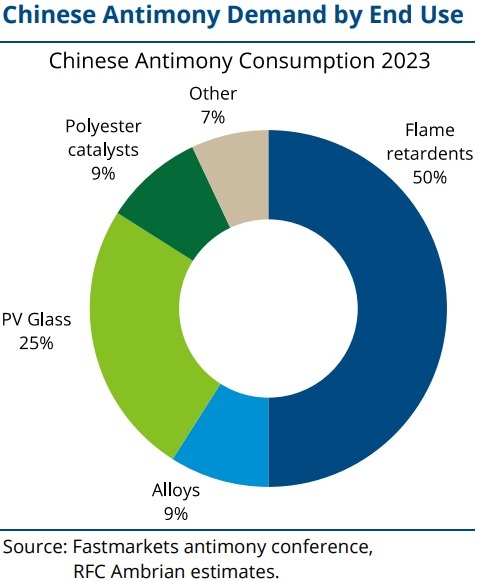 "Der Verbrauch von Antimon im Solarglas für Photovoltaikanwendungen ist in den letzten Jahren deutlich gestiegen und stellt mittlerweile den drittgrößten Verbrauchssektor dar. Der Ausblick deutet auf ein weiteres Wachstum hin, getrieben durch die anhaltende Expansion des PV-Sektors, insbesondere in China, das die PV-Glasindustrie dominiert. Das Wachstum in diesem Bereich dürfte sich trotz der jüngsten US-Zollerhöhungen auf importierte PV-Zellen aus China fortsetzen… China ist der führende Hersteller von Solarzellen und kontrolliert 80-90% bestimmter Segmente der globalen Solarlieferkette. Der Verbrauch von Antimon im Solarglas-Sektor ist in den letzten Jahren stark gestiegen und wurde für 2023 auf etwa 50.000 Tonnen geschätzt." (Quelle)