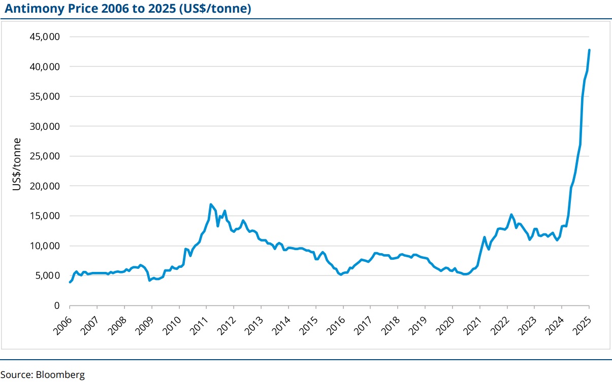 Vollbild / “Der Antimonmarkt steht derzeit unter erheblichem Druck, vor allem aufgrund eines Mangels an globalem Angebot von Erz und Konzentrat sowie der jüngsten Exportbeschränkungen Chinas, die die weltweite Verfügbarkeit raffinierter Produkte einschränken. Die ohnehin angespannte Situation verschärft sich zusätzlich, da es kaum neue Minenprojekte gibt, die in der Lage wären, Antimon wirtschaftlich zu fördern. Diese schwache Angebotslage, kombiniert mit dem weiter wachsenden Verbrauch im Photovoltaiksektor, deutet darauf hin, dass der Antimonmarkt über einen längeren Zeitraum defizitär bleiben dürfte.“ (Quelle)