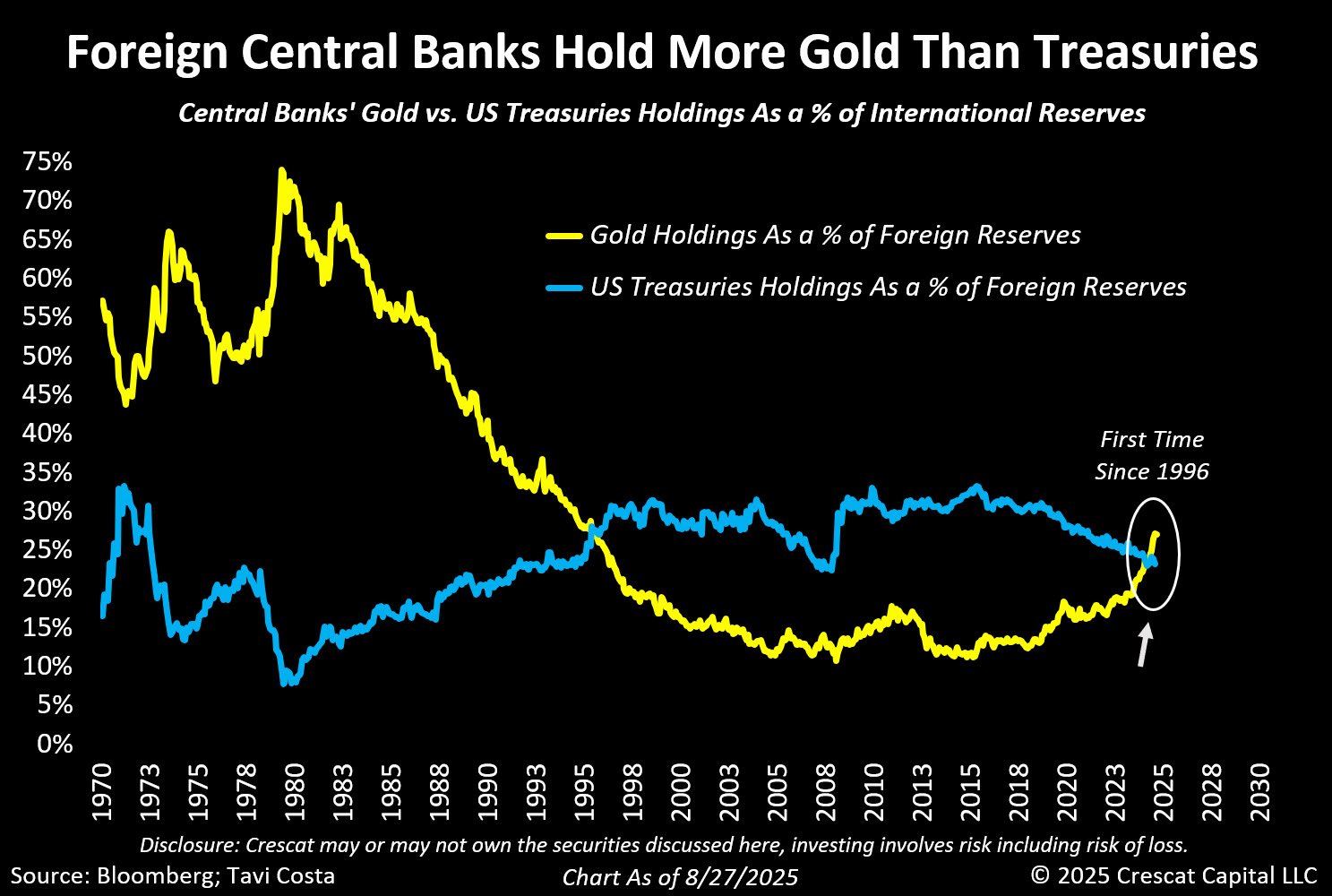 Full size / "Foreign central banks now officially hold more gold than US Treasuries — for the first time since 1996. Let that sink in. If you think this buying streak is ending, just look at what happened in the 1970s. This is likely the beginning of one of the most significant global rebalancings we´ve experienced in recent history, in my view." (Tavi Costa)