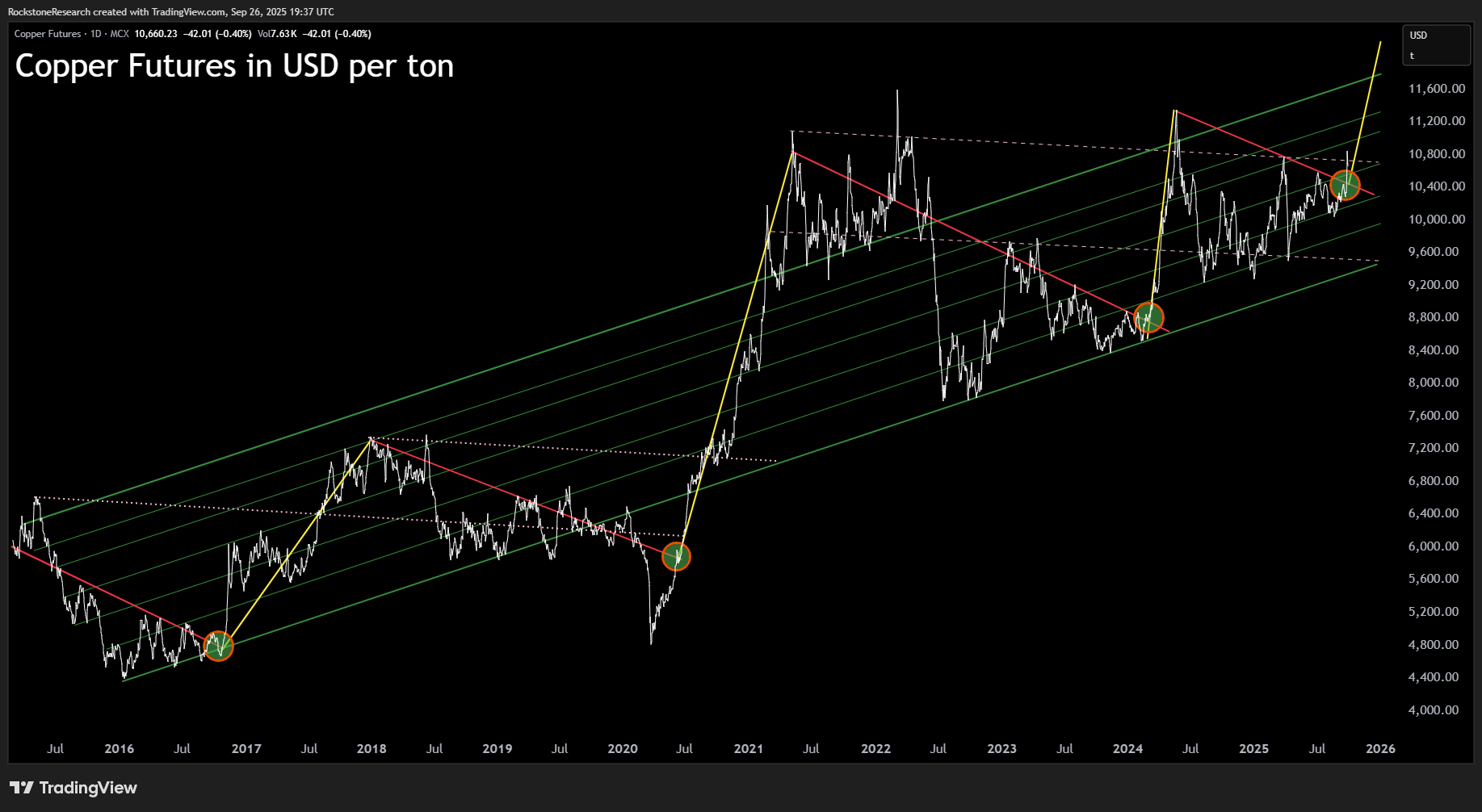 Full size / Source / Copper Futures in USD per Ton – Historical Breakouts Repeating: The chart highlights how copper consistently breaks major downtrends (red lines) with powerful rallies (yellow arrows), often triggered from long-term channel support (green). Each breakout has historically marked the start of a strong upside leg, as seen in 2017, 2020, and 2024. With the latest breakout now confirmed, copper is once again signaling the potential for a sharp move higher, targeting new highs above $11,000/t.