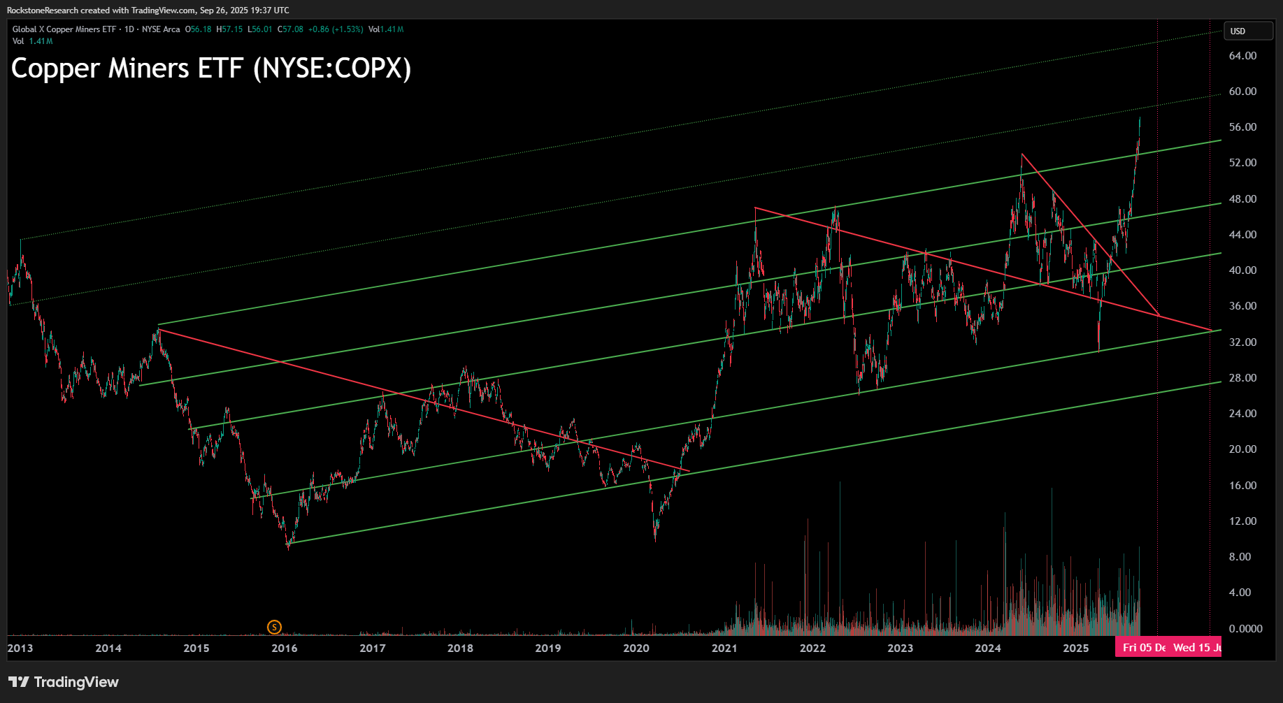 Full size / Source / Copper Miners ETF (NYSE:COPX) Breaking Higher: The chart shows copper miners surging to new highs, reflecting the powerful combination of rising copper prices and expanding margins across the sector. Large-cap producers have already delivered outsized returns, but the real asymmetric upside lies with copper exploration and development companies.