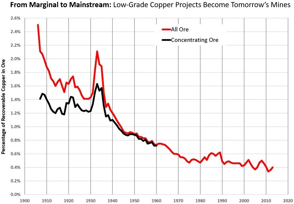 Above chart tells one of the most important stories in the copper industry: Ore grades have been in relentless decline for more than a century. A century ago, many of the world’s biggest copper mines operated on grades above 2%. Today, the global average has fallen to around 0.4%, a level that only a decade ago was considered uneconomic.