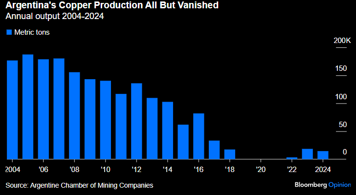 Full size / Argentina’s copper industry has all but disappeared over the past 2 decades, with annual production collapsing from over 180,000 t in the mid-2000s to near zero by 2024.