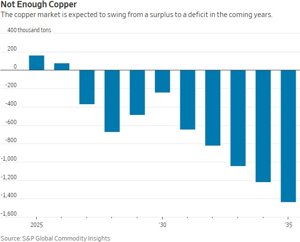 “For years, copper bulls have talked up its key role in the transition to green energy, needed for wind turbines, electric cars and grid infrastructure. Now, the metal is riding two new megatrends: artificial intelligence and rising military spending. A proposed $53 billion merger between Anglo American and Teck Resources, the mining sector’s biggest deal for a decade, amounts to a giant play on future demand for the base metal. Copper consumption has been climbing for years but new supplies aren’t expected to keep pace with demand... The rise of artificial intelligence is powering a wave of extra demand for copper... “Significant amounts of copper are required to build, power and keep these centers cool,” said Anna Wiley, head of BHP’s South Australia copper business, at a conference last month. BHP, which sought to buy Anglo American last year to cement itself as the world’s biggest copper producer, forecasts a 70% increase in demand for the metal by 2050... All these factors are key reasons that help explain why copper has been at the heart of dealmaking in the mining sector in recent years – and why analysts say the proposed Anglo-Teck tie-up could spur rival offers as companies jostle for copper assets.“ (Excerpts from The Wall Street Journal‘s “Mining Megadeal Shows the World Is Crazy for Copper: Artificial intelligence and rising military spending are further buoying demand for the metal“ on September 10, 2025)