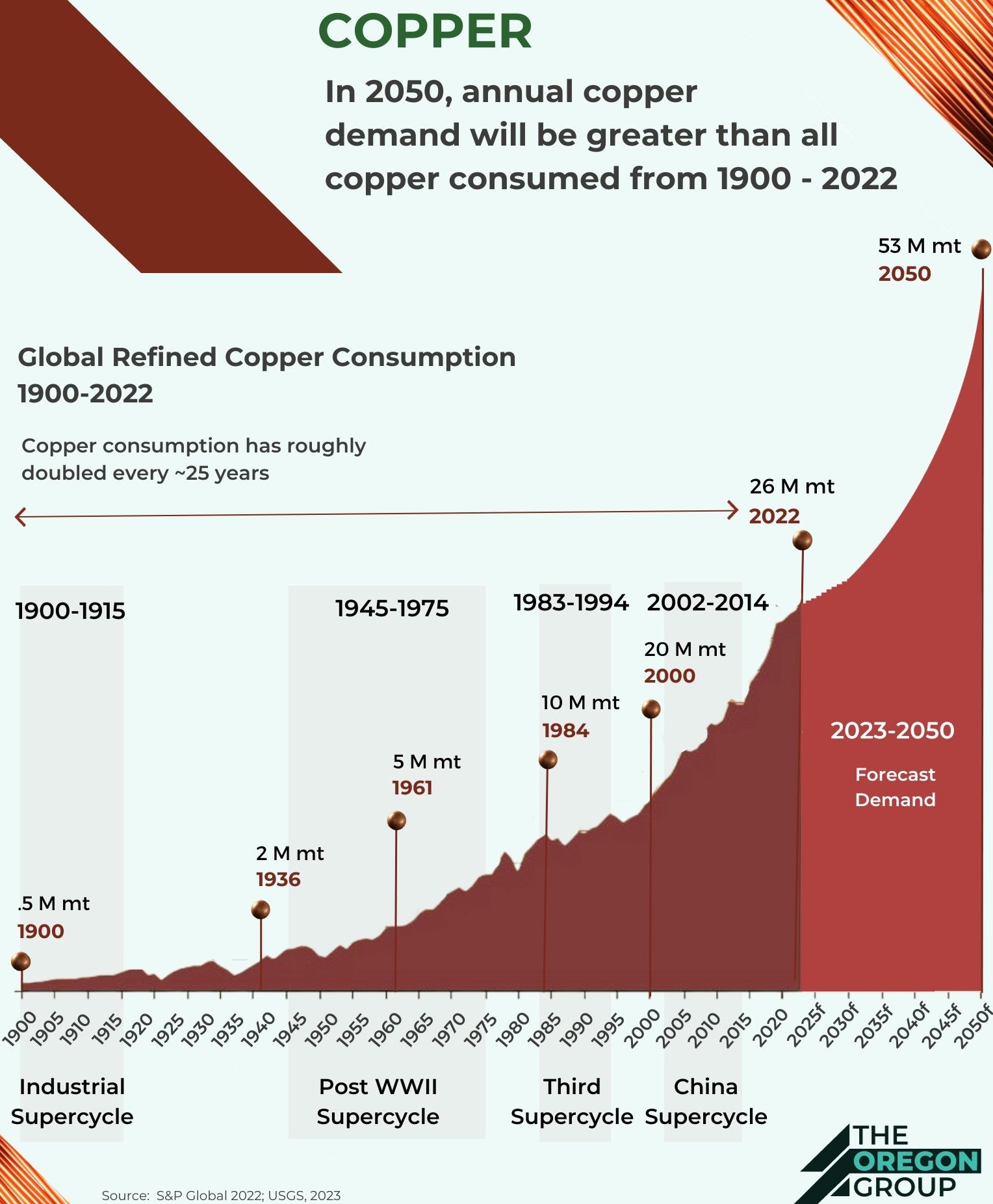 • The Green Transition (2020s): Today, copper underpins electrification, renewable energy, and digital infrastructure – driving structural demand that promises to shape the next supercycle.