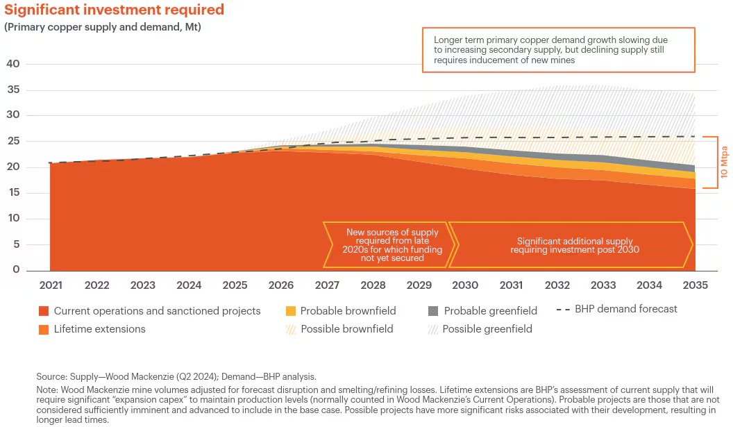 Above chart highlights that even with lifetime extensions of existing mines and probable brownfield expansions, new sources of supply will need to be secured urgently. BHP’s demand forecast points to nearly 35 million t of copper needed annually by 2035, yet existing supply pipelines cover barely two-thirds of that requirement. This leaves a major investment gap in both greenfield and brownfield developments – projects that typically face long lead times, high capex, and rising regulatory hurdles.