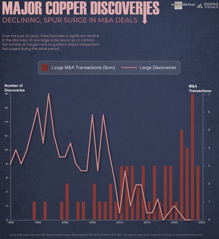 Full size / Source / Over the past 25 years, the discovery of new world-class copper deposits has fallen dramatically, even as industry exploration spending has surged. The chart illustrates how large discoveries have trended steadily downward, while mergers and acquisitions (M&A) have accelerated to fill the gap. With fewer genuine discoveries being made, major producers are increasingly forced to grow through consolidation, bidding up the value of existing assets.