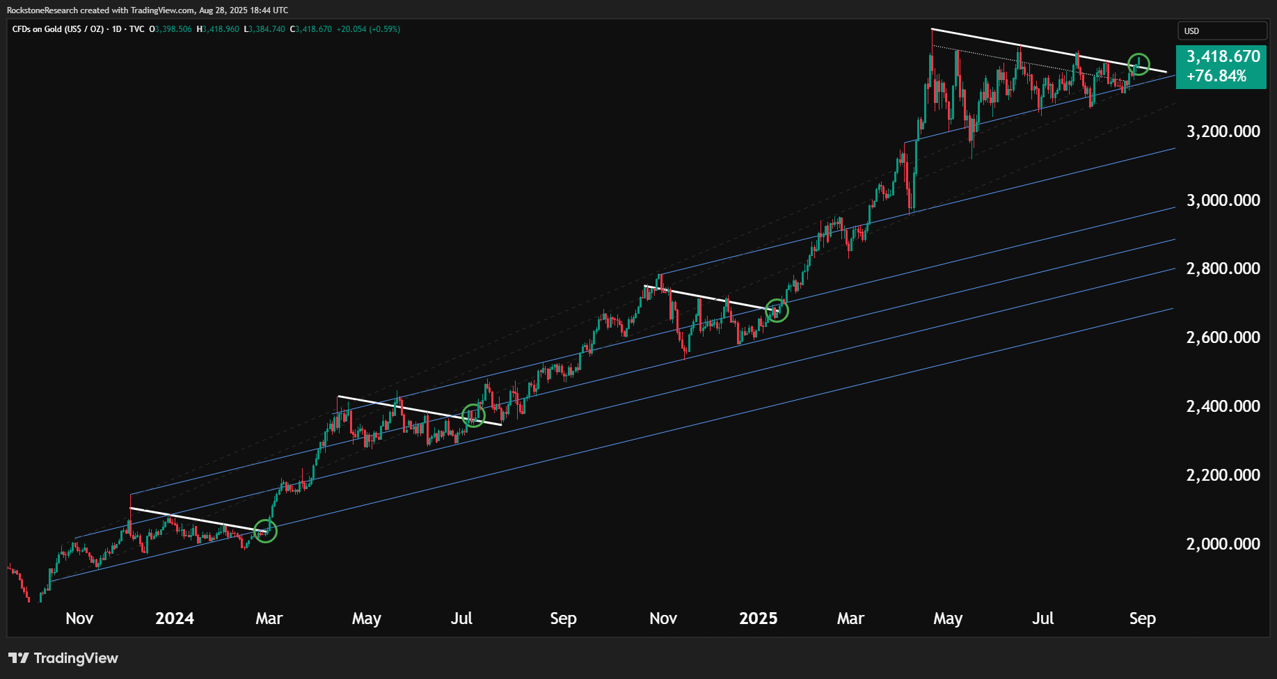 Vollbild / Gold seit September 2023: Der Chart zeigt eine klare Abfolge von Konsolidierungsphasen (weiße Dreiecke), gefolgt von markanten Ausbrüchen (grüne Kreise). Jeder Ausbruch führte zu höheren Kursniveaus im langfristigen Aufwärtstrendkanal. Der jüngste Sprung über $3.400 USD signalisiert, dass die Aufwärtsdynamik weiterhin intakt ist.