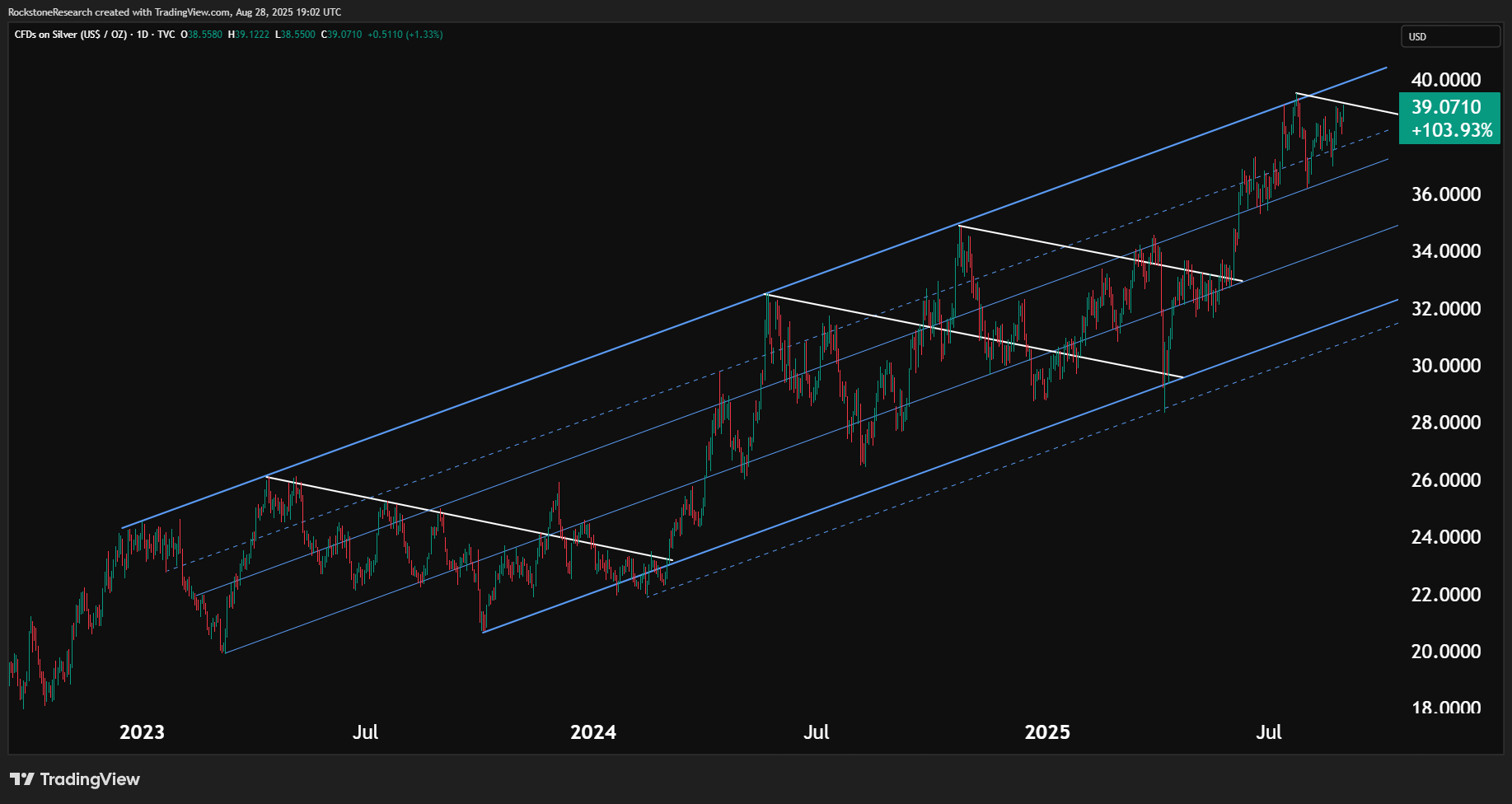 Vollbild / Silber seit September 2022: Die Kursentwicklung spiegelt das frühere Verhalten von Gold wider: Wiederholte Konsolidierungen, die nach oben aufgelöst werden. Mit aktuell rund $39 USD je Unze sieht es danach aus, dass Silber nun über die Marke von $40 USD auszubrechen versucht. Trotz der starken bisherigen Rally liegt das Metall aber noch immer unter seinem Hoch von 2011 bei ca. $50 USD – während Gold seine damaligen Rekordstände längst weit übertroffen hat.