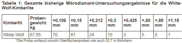 - Bohrprogramm - Besteht aus ungefähr acht Bohrlöchern (1.500 m) einschließlich der beiden Wolf-Kimberlite. Aus jedem der Wolf-Erzkörper wird eine Bohrkernprobe von500 kg entnommen, die mittels Alkalischmelze analysiert wird. Sollten bei der geophysikalischen Bodenuntersuchung weitere kimberlitartige Ziele identifiziert werden, so werden diese Ziele gegebenenfalls zu diesem Zeitpunkt bebohrt. In der nachstehenden Tabelle 1 sind die bisherigen Mikrodiamant-Ergebnisse zusammengefasst. Falls neue Kimberlite entdeckt werden, werden diese weiter analysiert, um mittels Alkalischmelze die Diamanten-Ergebnisse zu erhalten.