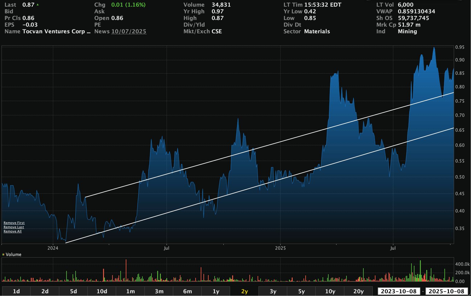 Vollbild / Der 2-Jahres-Chart von Tocvan Ventures Corp. an der kanadischen Heimatbörse zeigt einen stabilen Aufwärtstrendkanal mit stetig höheren Tiefs und Hochs. Nach den jüngsten Entdeckungen auf dem Gran Pilar Gold-Silber-Projekt zieht das Handelsvolumen deutlich an. Bei Rekord-Goldpreisen und unmittelbar bevorstehenden Bohrungen deutet alles darauf hin, dass Tocvan vor einer fundamentalen Neubewertung steht.