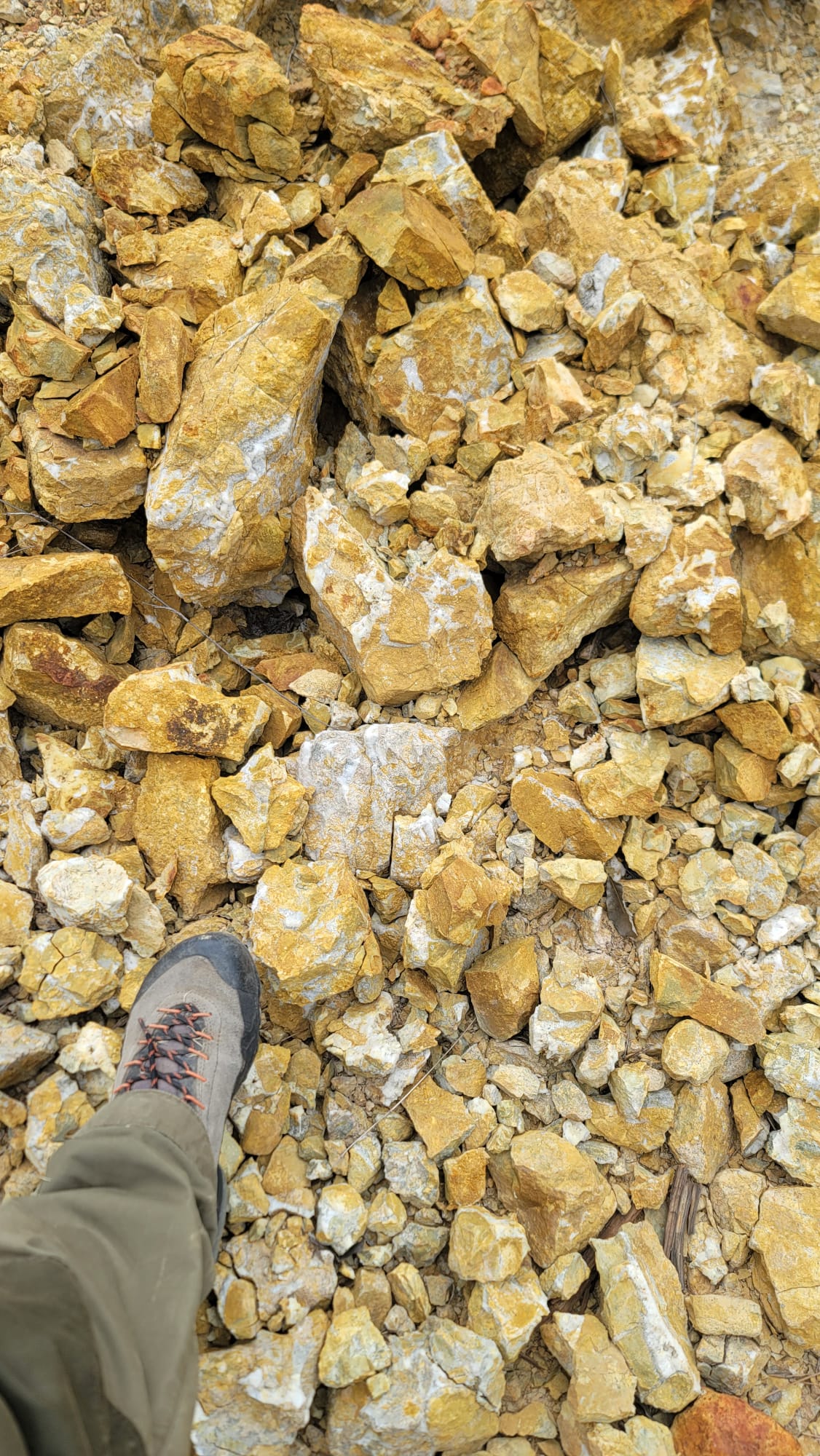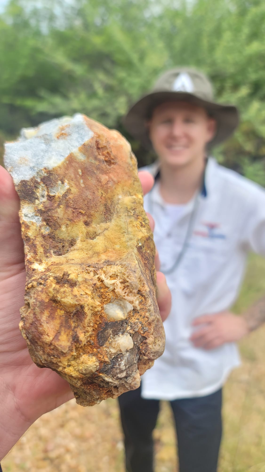 • Auf dem ersten gezeigten Foto ist eine besonders markante Quarz-Brekzie mit Eisenoxid zu sehen: Genau jene Strukturen, die in vergleichbaren Systemen oft mit hochgradiger Gold- und Silbervererzung in Zusammenhang stehen.