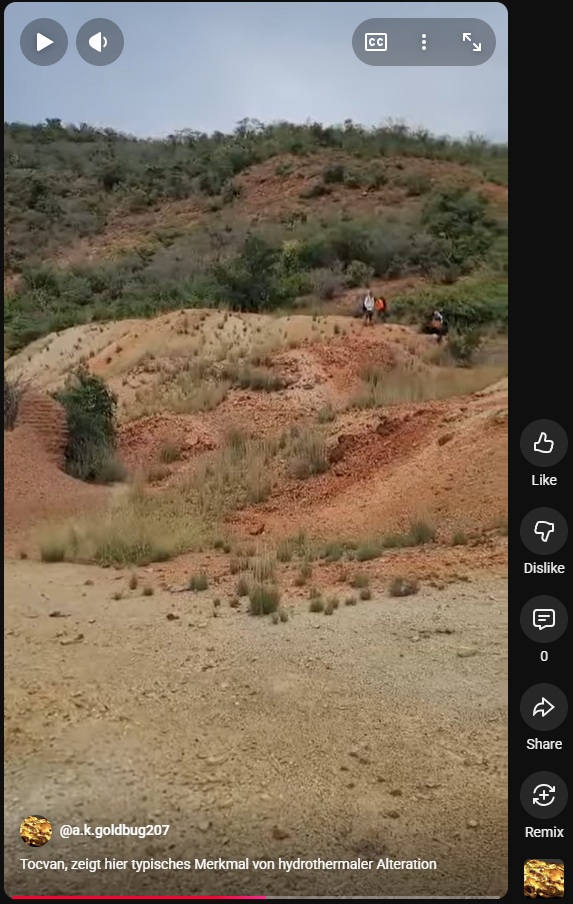 In den auf X.com veröffentlichten Videos werden eindrucksvoll die stark oxidierten, rötlich-braunen Gesteinszonen gezeigt, die an der Erdoberfläche der North Alteration Zone auftreten. Diese auffällige Färbung ist ein typisches Merkmal von hydrothermaler Alteration, bei der eisenhaltige Minerale an der Luft oxidieren – ein klarer Hinweis auf oberflächennahe Gold- und Silbermineralisierung. Die gezeigten Aufschlüsse liegen innerhalb einer über 3 km langen und 1,5 km breiten Alterationszone, die durch Pyrit-, Ton- und Eisenoxid-Minerale geprägt ist. Solche Gesteine sind besonders interessant, weil sie leicht abbaubare Erztypen darstellen und häufig direkt an goldführende Quarzadern grenzen.