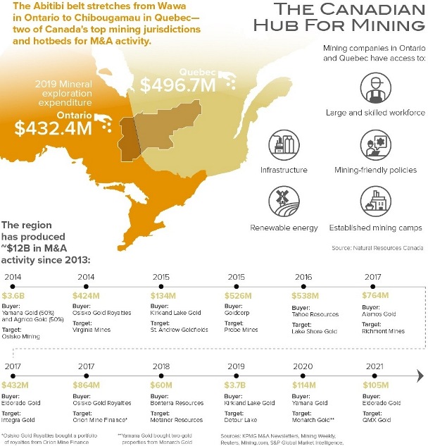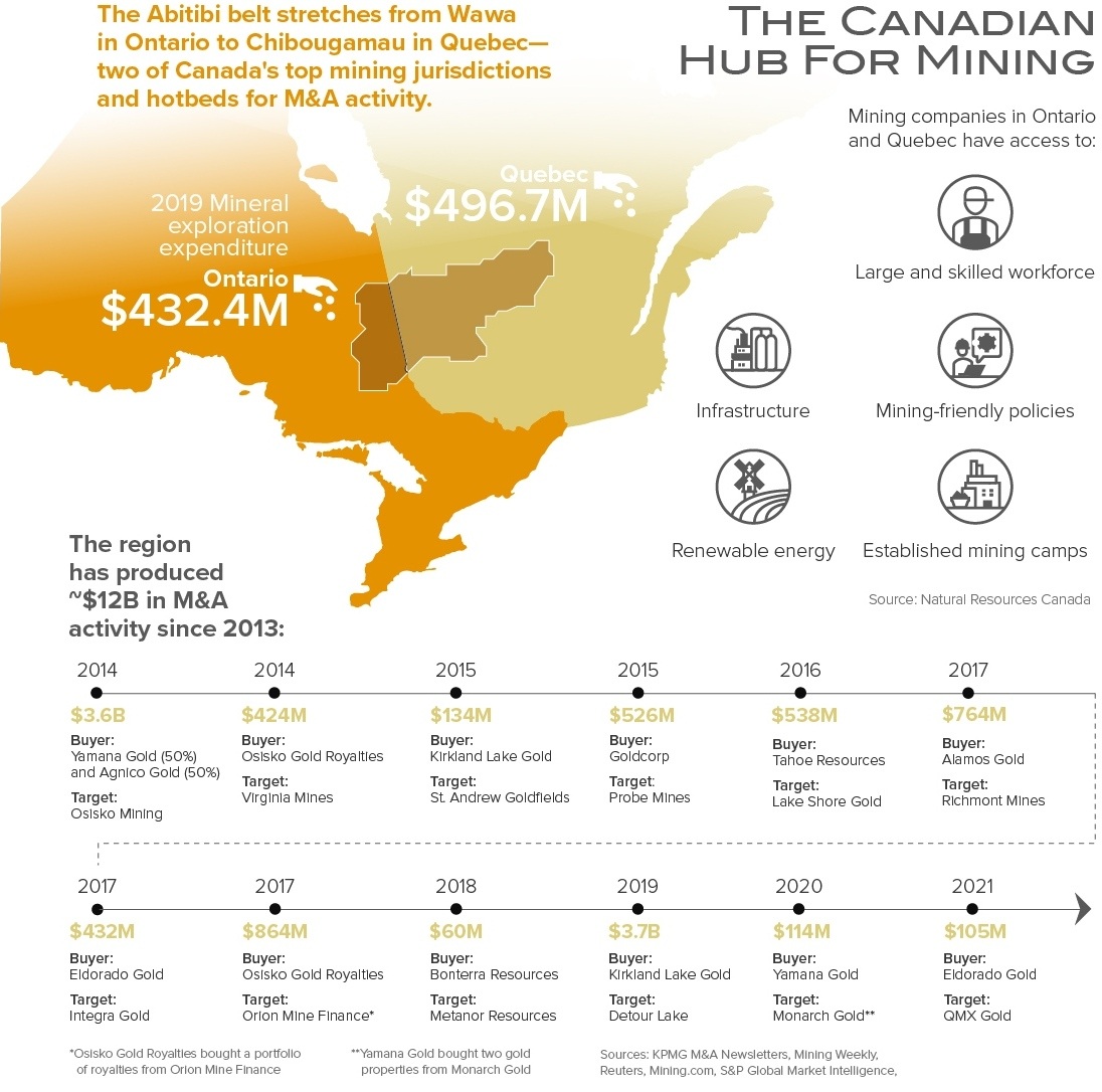 Full size / Source / Historic snapshot of Abitibi M&A activity up to 2021. Since then, major deals have continued to reshape the region – such as Agnico Eagle’s $13.5 billion merger with Kirkland Lake Gold in 2022, its full ownership of Canadian Malartic in 2023, and the strategic acquisition of Osisko Mining by Gold Fields in late 2024 – proof that this belt remains a hotbed for high-stakes consolidations.