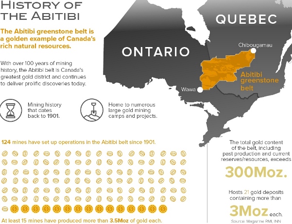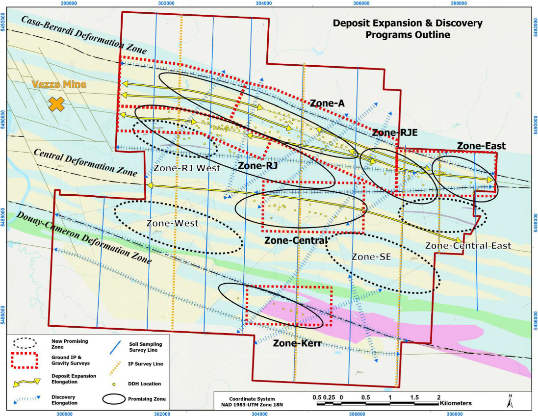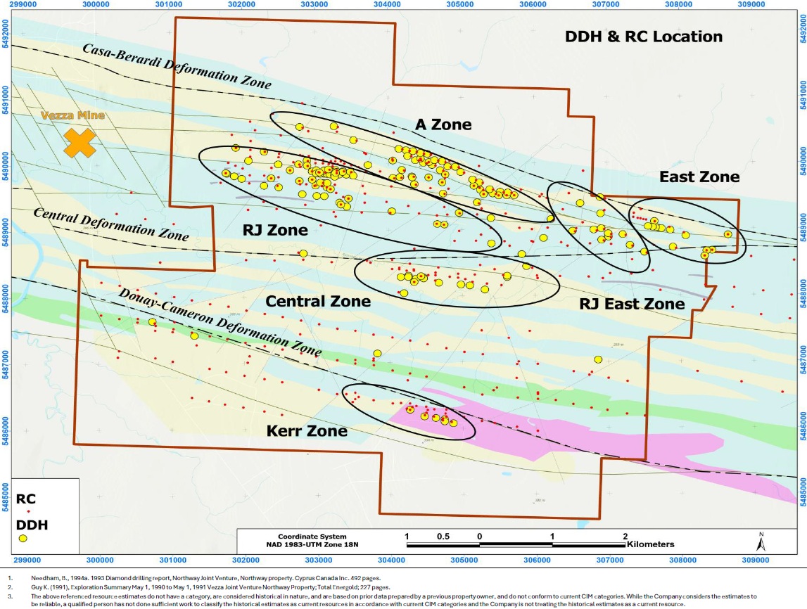 • The property lies just 1.5 km east of the past-producing Vezza Gold Mine (Measured & Indicated: 261,110 ounces of gold based on 1.25 million tonnes averaging 6.5 g/t gold) and about 120 km east of Hecla Mining‘s Casa Berardi Gold Mine (Proven & Probable: 1.3 million ounces of gold; a recent technical report outlines a 14-year open-pit reserve mine plan, anticipated to produce approximately 1.04 million ounces of gold over that timeframe).