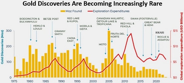Full size / The New Gold Halving: Since 2005, the amount of gold discovered declined by 50% every 5 years. “We are running out of new gold discoveries.“ (Source)