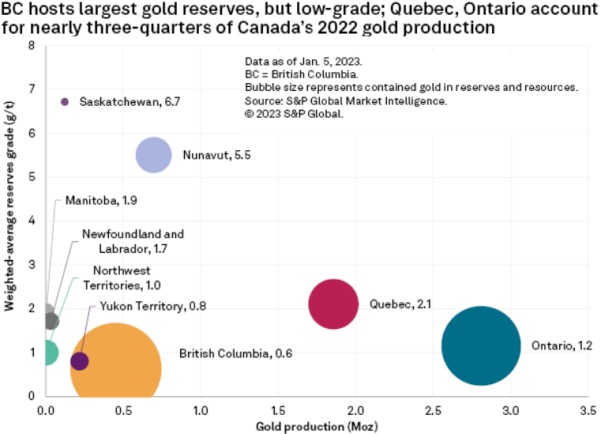 Full size / Source / This chart shows gold production (Moz) versus average reserve grade (g/t) by province. Quebec (2.1 g/t) and Ontario (1.2 g/t) produced nearly 75% of Canada’s gold, while British Columbia holds the largest reserves but with the lowest grade (0.6 g/t).
