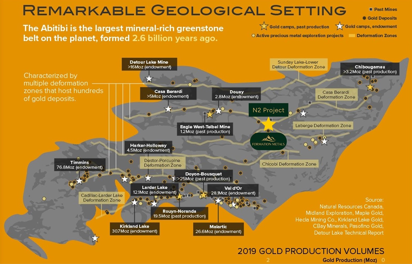 Disclaimer and Information on Forward Looking Statements: Rockstone Research, Zimtu Capital Corp. (“Zimtu“) and Formation Metals Inc. (“FOMO“; “the Company“) caution investors that any forward-looking information provided herein is not a guarantee of future results or performance, and that actual results may differ materially from those in forward-looking information as a result of various factors. The reader is referred to the FOMO‘s public filings for a more complete discussion of such risk factors and their potential effects which may be accessed through its documents filed on SEDAR at www.sedarplus.ca. All statements in this report, other than statements of historical fact should be considered forward-looking statements. Much of this report is comprised of statements of projection. Statements in this report that are forward looking include that FOMO aims to unlock the gold ounces majors want; that, with the drills now turning, Formation Metals is positioned to grow its ounces in a mining-friendly jurisdiction that majors know – and covet; that gold is just the start; that gold, titanium, and critical battery metals are the commodities set to define the next decade; that FOMO is laser-focused on proving potential, scaling resources, and positioning for a premium-value exit; that FOMO is poised to turn exploration success into the next big North American mining story; that the majors are prepared to pay premiums for high-grade, expandable resources in safe jurisdictions; that a smaller, richer deposit often delivers better economics than a sprawling low-grade one; that FOMO’s ongoing drill program aims to confirm and expand the historical resource and, if successful, FOMO could be exactly the kind of target the majors are hungry for; that FOMO is drilling at N2 to validate and grow a historical resource in a tier-one jurisdiction; that success could place FOMO squarely on the radar of acquisitive majors seeking high-grade ounces with room to expand; that N2 offers a compelling mix of known mineralization, district-scale upside, and near-term catalysts that have the potential to significantly advance the project’s development and strategic importance; that, based on our ongoing review and planning for Phase 1, we feel comfortable in expanding our maiden drill program to a fully funded 10,000 metres; that mineralization begins at surface, offering strong potential for near-surface resource definition; that, with N2 being close to operating mills, there is potential for streamlined development and lower CAPEX; that, at RJ Zone, there are multiple high-grade historical drill intercepts, open along strike and at depth, suggesting strong expansion potential; that the drill program is designed to focus on discovery drilling at new high-potential targets along the mineralization strikes at the “A”, “RJ”, and “Central” zones in the northern part of the property in order to discover new auriferous trends and unlock new zones of gold mineralization; that the program will also focus on high-priority infilling and expansion targets in these zones to significantly enhance the auriferous zones identified to date; that FOMO also believes that N2 has significant base-metal potential; that there is strong potential for elevated base-metal (Cu-Zn) concentrations across the property; that the drill program is designed not only to test for extensions of the known mineralized zones but also to validate and upgrade the historical resource to NI 43-101 compliance; that confirmation plus expansion can deliver a double re-rating effect – first from verification of ounces, then from resource growth; that this geological setting is typical of large, structurally hosted gold deposits found throughout the Abitibi Greenstone Belt; that the planned 10,000-metre program aims to confirm historical drill results to underpin an NI 43-101 compliant resource, step out along strike and down dip to expand mineralized zones, and test new targets identified from reinterpreted geophysics and structural mapping; that the initial focus of the drilling program will be on the A Zone and RJ Zone; that, for investors, there is a short timeline to value creation, there is leveraged exposure to the gold price with each additional compliant ounce in Québec translating directly into enterprise value, and that there is district-scale upside with the seven known zones and under-explored targets giving N2 potential far beyond its historical estimate; that we are likely entering the Golden Age of Mining; that major gold producers are not only more profitable than they have been in over a decade, but also financially positioned to pursue aggressive growth strategies, including acquisitions; that these cash-rich miners may soon turn their attention to well-positioned exploration companies – precisely the kind of opportunity that Formation Metals’ N2 Gold Project represents; that a similar transformation now appears to be unfolding in the mining sector; that the Nicobat Project offers significant upside; that, at Nicobat, there is a clear opportunity to add value through new drilling and updated resource definition; that FOMO intends to re-evaluate the historical dataset at Nicobat, deploy advanced geophysics, and execute targeted drilling to confirm and potentially expand the resource base; that metallurgical studies and environmental baseline work will also be part of the program to position Nicobat for future development; that, with the clean-energy transition accelerating, demand for these critical minerals is forecast to grow strongly in the coming decade; that Nicobat could quickly move to the forefront of the company’s exploration plans; that Rio’s proximity provides not only geological validation but also logistical advantages; that Rio Tinto, with $2.5 million in support from the Quebec government, will invest $7.6 million in an industrial demonstration project to test ore-sorting technology a