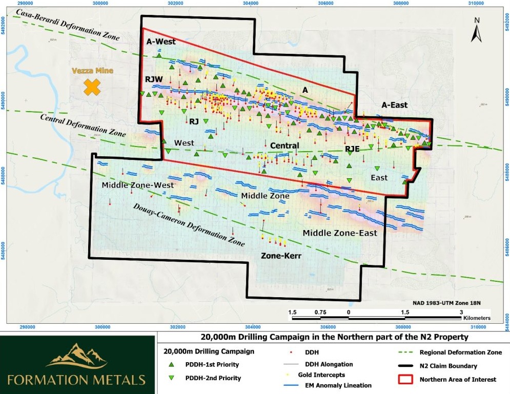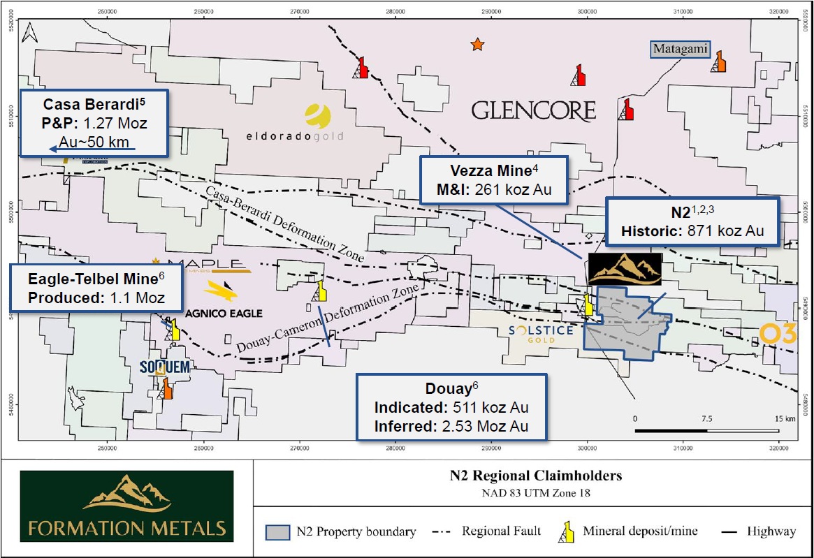• Covering ~4,400 hectares in 87 claims held 100% by Formation Metals through acquisition from Wallbridge Mining Company, the N2 Gold Project is a mesothermal gold system situated within Québec’s prolific Casa Berardi Deformation Zone.