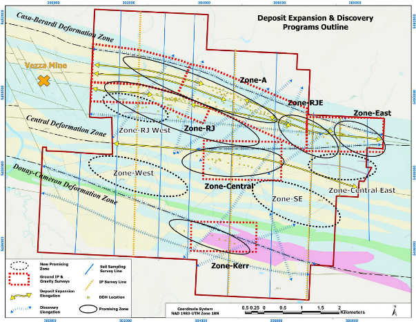 The initial focus of the drilling program will be on the A Zone and RJ Zone, where previous operators intersected broad zones of mineralization that remain open.