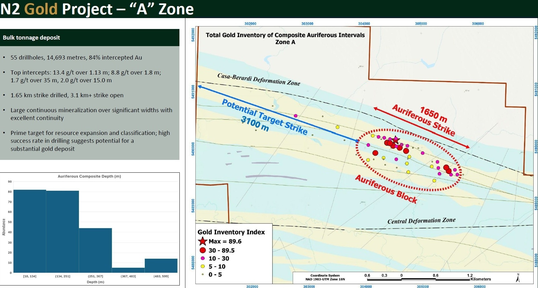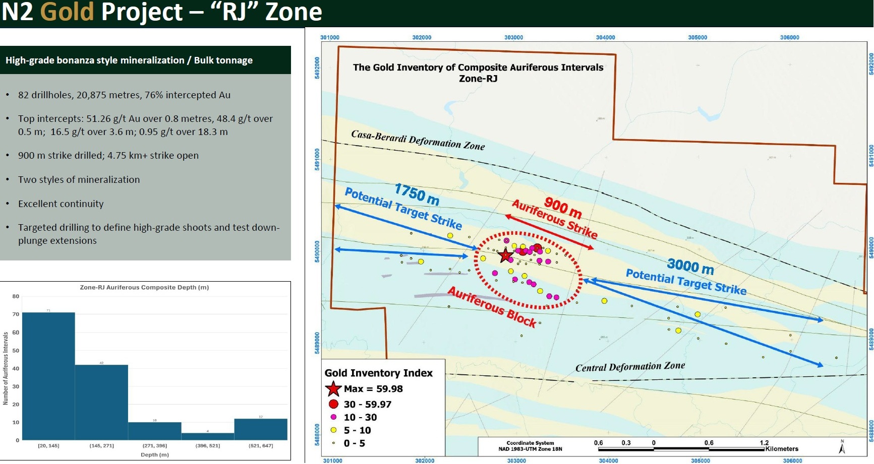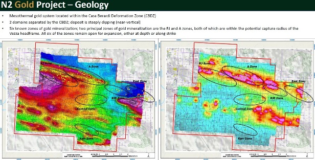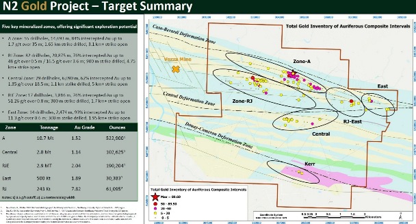 N2 has been extensively explored over decades, with multiple operators defining 7 distinct gold zones, the most significant being the A Zone and RJ Zone.