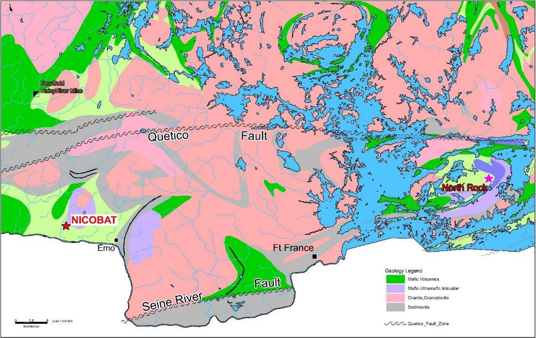 • The 2,490-hectare Nicobat property is located in the Rainy River District, within the mining-friendly Wabigoon Subprovince of the Superior Province.
