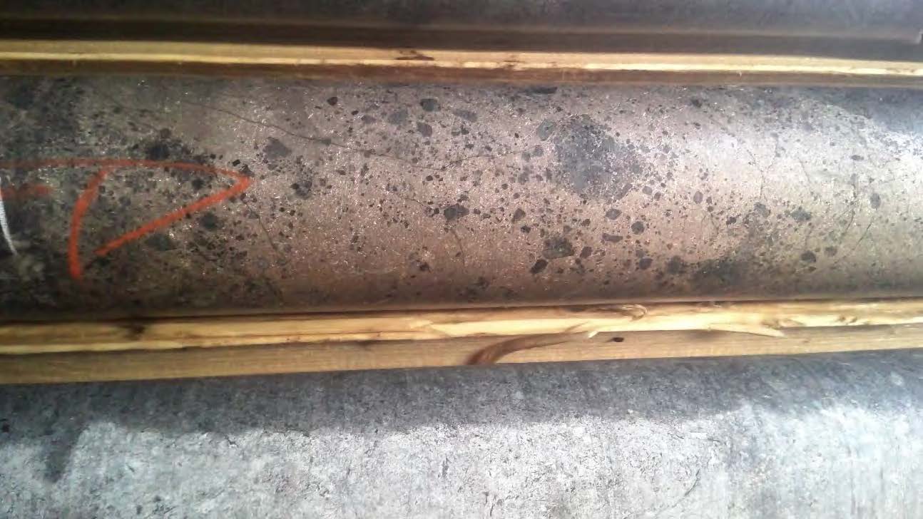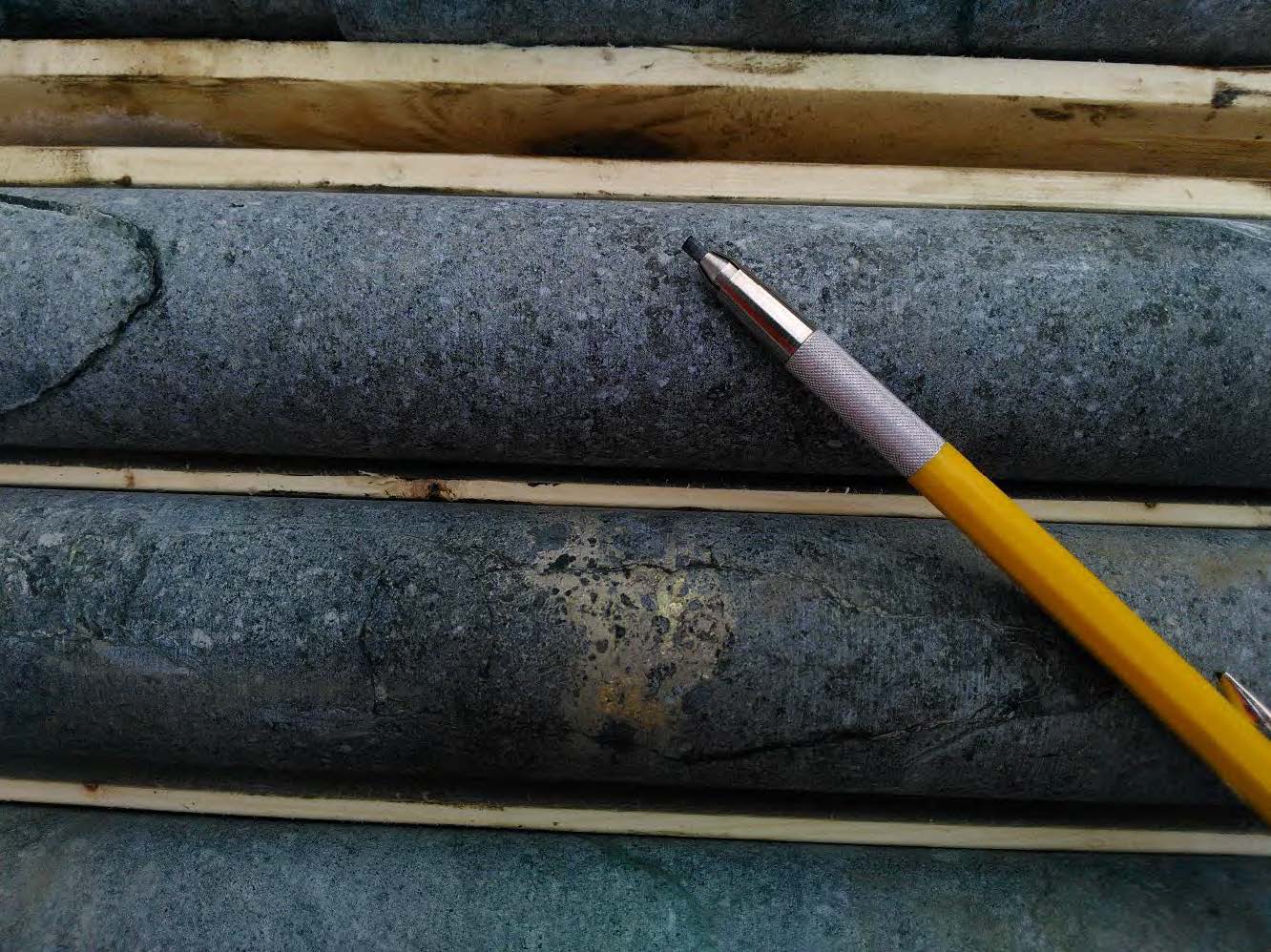 Full size / Drill core showing pyrrhotite + chalcopyrite sulphide aggregate. (Source: Technical Report on the Nicobat Project; April 19, 2022)