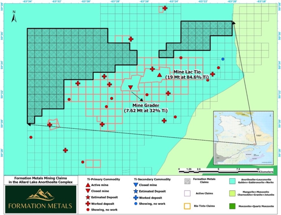 Full size / Formation Metals‘ mining claims in the Allard Lake Anorthosite Complex, adjacent to Rio Tinto‘s Lac Tio Mine (19 million t @ 84.6% Ti) and the Grader Mine (7.62 million t @ 32% Ti). The Grader Mine lies ~4 km southwest of the Lac Tio ilmenite open-pit mine. The area connects via Rio Tinto’s private railway, the Chemin de fer de la Rivière Romaine, which links the mine to Havre‑Saint‑Pierre port. On June 12, 2025, it was announced that Rio Tinto, with $2.5 million in support from the Quebec government, will invest $7.6 million in an industrial demonstration project to test ore-sorting technology at its Lac Tio Mine.