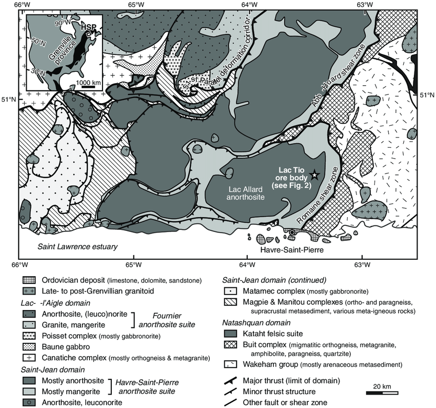 Full size / Geological map of the Havre Saint Pierre (HSP) anorthosite suite (simplified after Gobeil et al). The HSP anorthosite suite s an intrusive complex covering ~11,000 km². It hosts the Lac Tio deposit – the world’s largest hard-rock ilmenite mine – and several other Fe-Ti-P oxide-rich intrusions such as the Grader layered intrusion. The Lac Tio Mine is producing hemo-ilmenite for titanium dioxide pigments. The Lac Tio Mine is one of only two major hard-rock ilmenite producers worldwide (the other being Tellnes, Norway). The HSP anorthosite suite is not only geologically significant but also economically strategic. Its massive ilmenite resources, proven mining history, and potential for additional Fe-Ti-P oxide discoveries make it one of the most important titanium districts globally. In a world shifting toward critical mineral security, the HSP suite’s titanium endowment is a tier-one asset.