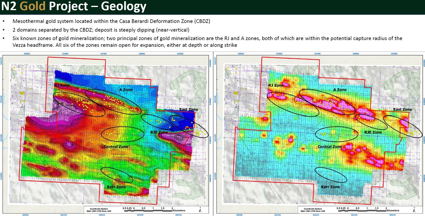 Full size / “The drill program is designed to focus on discovery drilling at new high-potential targets along the mineralization strikes at the “A”, “RJ” and “Central” zones in the northern part of the Property in order to discover new auriferous trends and unlock new zones of gold mineralization. The program will also focus on high-priority infilling and expansion targets in these zones to significantly enhance the auriferous zones identified to-date... The Company also believes that N2 has significant base metal potential, where it recently completed a revaluation process which revealed significant copper and zinc intercepts within historic drillholes known to have significant gold grades (>1 g/t Au). Assay results range from 200 to 4,750 ppm and 203 ppm to 6,700 ppm, for copper and zinc, respectively, indicating strong potential for elevated base metal (Cu-Zn) concentrations across the property, specifically at the A and RJ zones. Property wide geology at N2 features volcanic and sedimentary rocks formed in regional anticlinal and synclinal flexures. Three principal deformation structures, oriented along the known NW-SE to WNW-ESE structural trends typical of VMS deposits in the Matagami region, function as critical geologic controls for mineralization on the property.“ (Source)