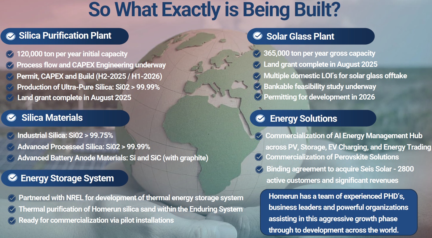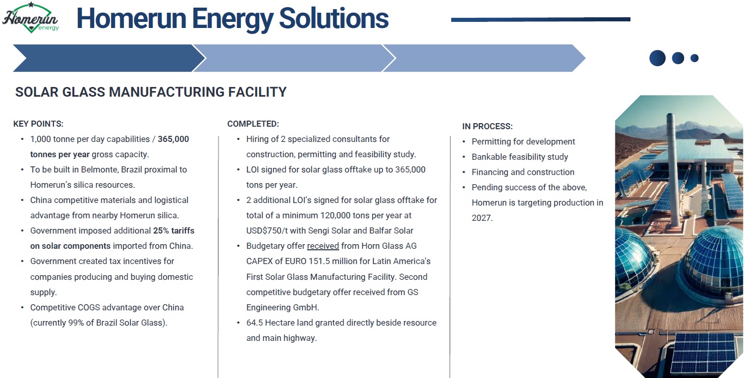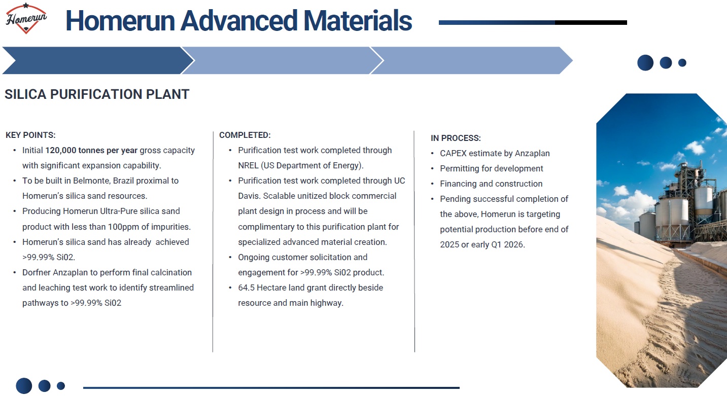 • Vertical Integration: Homerun is not simply a mining play – it is building a vertically integrated energy materials business, including a 120,000 tonnes/year silica processing plant, a 365,000 tonnes/year solar glass facility, and partnerships with UC-Davis and the U.S. Department of Energy/NREL on advanced purification and storage technologies.