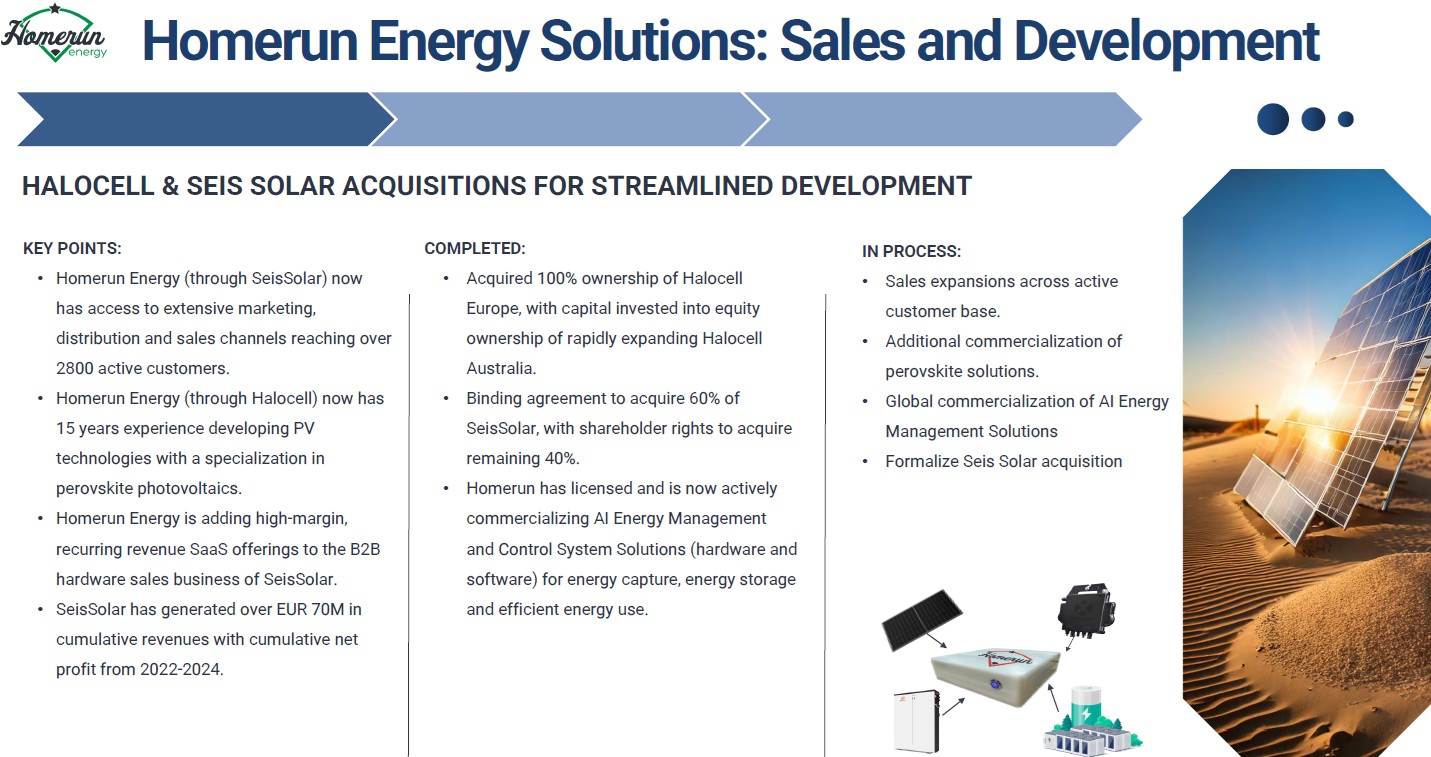• Highlight: Seis Solar brings 2,800 active customers and 70 million EUR in cumulative revenues in the last 3 years (2022-2024); Halocell adds breakthrough perovskite PV tech. Combined with AI energy trading and management, Homerun is building a recurring revenue engine